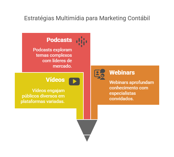 Restringir sua produção de conhecimento a um único formato é subutilizar seu potencial. O marketing de conteúdo avançado para grandes escritórios contábeis exige uma presença multimídia, capaz de engajar diferentes perfis de público em diversas plataformas.