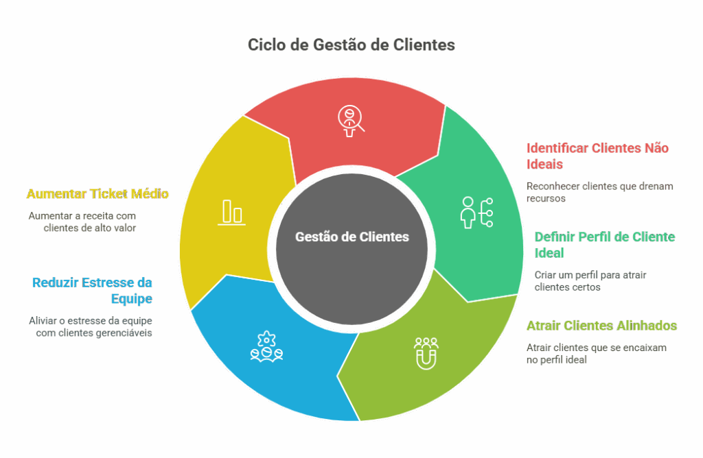 Aqui está um segredo sujo da contabilidade: clientes errados sugam mais lucro do que você imagina. Eles ocupam horários de reunião que poderiam ser usados para clientes premium, enchem sua equipe de demandas irrelevantes e ainda mancham sua reputação com indicações meia-boca.